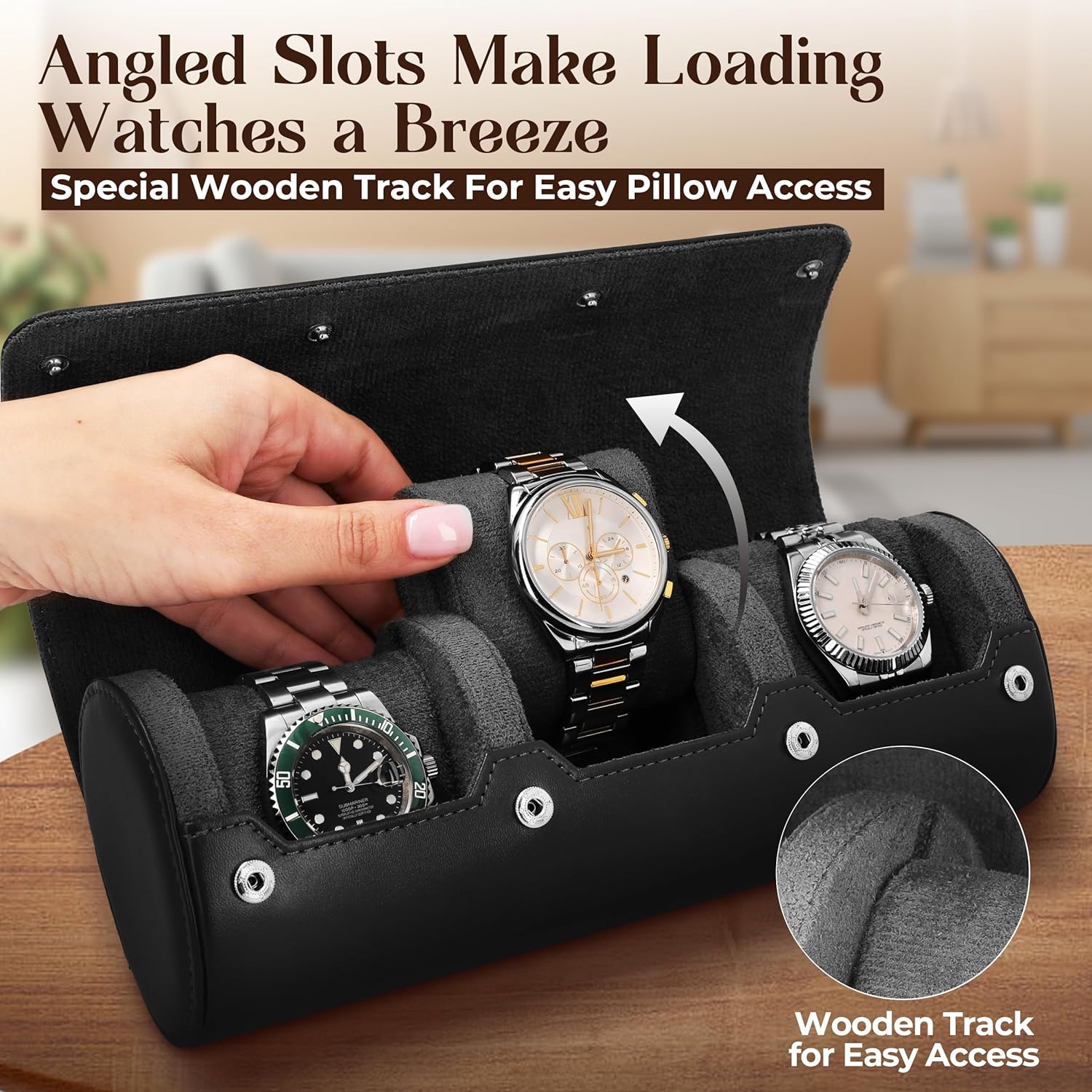 • EASY-TO-MOVE PADDED CUSHIONS: The newly re-engineered track angle is ultimate convenience, each padded cushion can be independently and smoothly moved in and out with one hand, ensuring a snug fit for your timepieces and hassle-free handling without disturbing other watches or cushions. Can hold watches from wrist size 6.5″ and oversize watches.